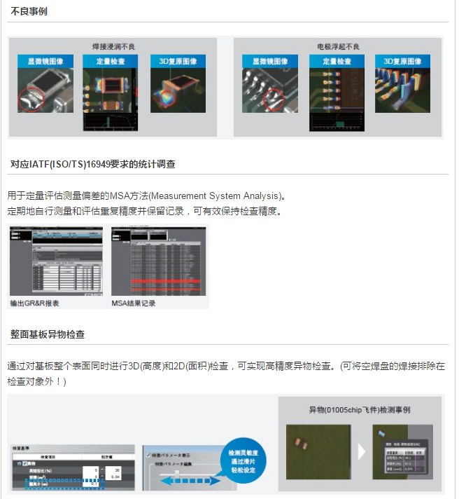 实现对焊接的接合(Solder Joint)状态和贴装状态的定量检查。按照标准进行良品基准检查,将遗漏未知不良的风险降至最低。对检查的直接启动作出贡献。